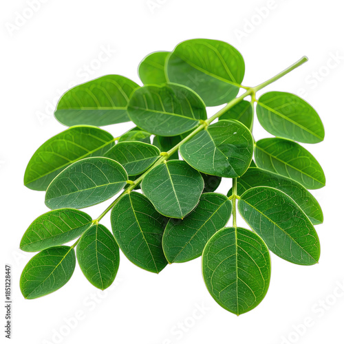 © Nani, Obraz premium Vibrant green moringa leaves isolated on a solid black background.