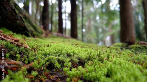 © buraratn, Naklejka premium Vibrant Green Moss Covers the Forest Floor Surrounded by Tall Trees in a Peaceful Natural Habitat Under Soft Diffused Light