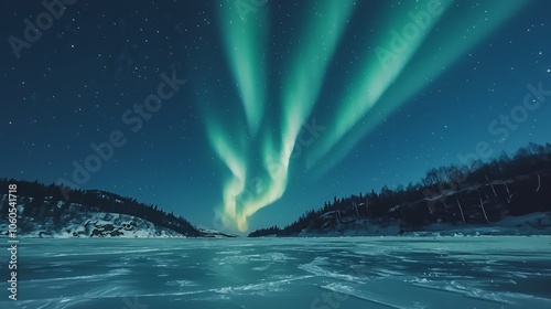 Naklejka premium Vibrant green Northern Lights illuminate a frozen lake in the snowy,...