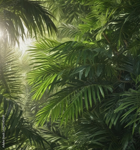 Fototapeta premium Vibrant green palm fronds, sunlight dappled, lush texture, sunlight, nature...