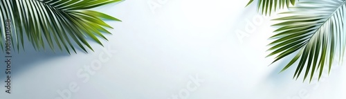 Obraz premium Vibrant green palm leaves frame a serene light blue background, creating a...
