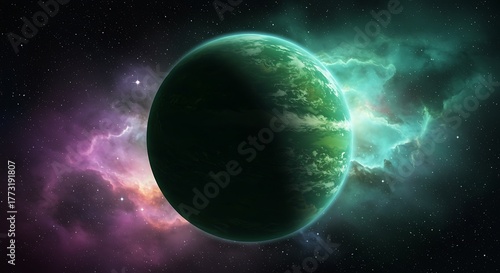 Obraz premium Vibrant Green Planet Amidst Cosmic Nebula with Stunning Colors.