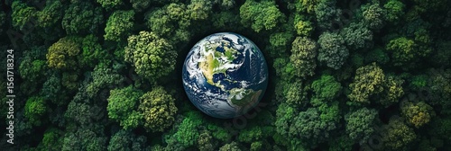 © Ilja, Obraz premium Vibrant Green Planet Over Lush Forest Landscape, Symbolizing Nature s Beauty and Environmental Hope