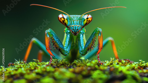 © Herdi, Fototapeta premium Vibrant green praying mantis with orange legs perched on moss, close-up.
