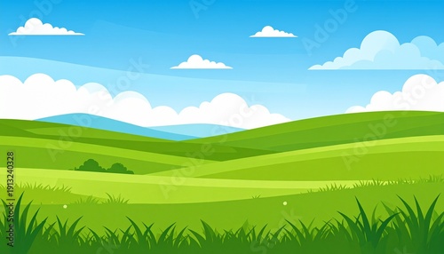 © Rama, Fototapeta premium Vibrant green rice field landscape with blue sky and fluffy clouds summer nature scenery