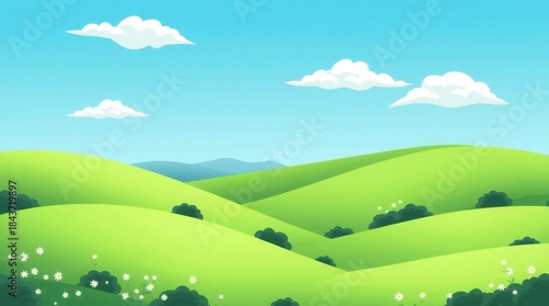 Fototapeta premium Vibrant green rolling hills under a clear blue sky with fluffy white clouds