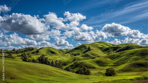 Fototapeta premium Vibrant green rolling hills under a dramatic blue sky with fluffy white...
