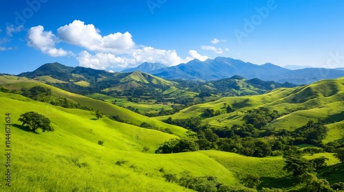 Fototapeta premium Vibrant Green Rolling Hills Under Majestic Blue Sky Symbolizing Peaceful...