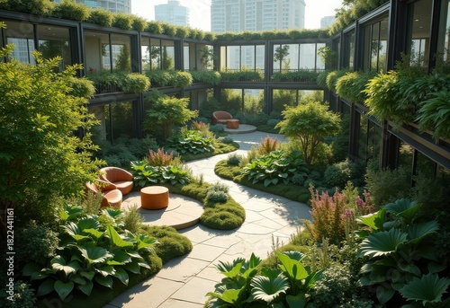 Obraz premium Vibrant Green Roof Garden Urban Oasis Lush Flora Sustainable Ecology Sky...