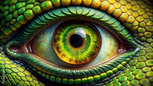 © Sirinporn, Obraz premium Vibrant green scaly eyelid partially closed, revealing a piercing yellow iris with a black vertical pupil, surrounded by intricate patterns and textures.