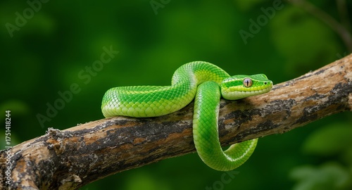 © Faha Studio, Obraz premium Vibrant Green Serpent Coiled on Branch, Reptile Nature Detail