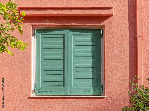 © Dimitrios, Fototapeta premium vibrant green shutters window on peach colored wall