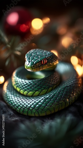 © Dmitriy, Obraz premium Vibrant green snake coiled among twinkling lights in a festive setting during evening hours