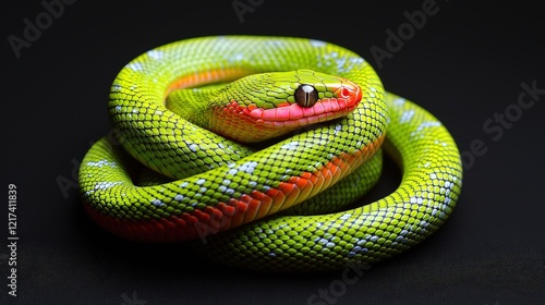 © Keattipoom, Obraz premium Vibrant Green Snake Coiled Elegantly on a Dark Background Showcasing Its Unique Texture and Striking Colors