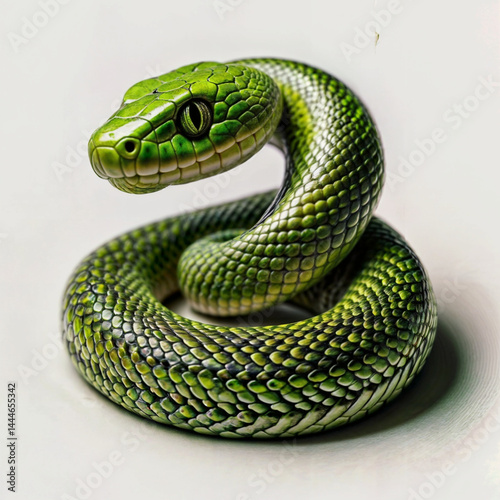 © VECZOMLAND, Fototapeta premium Vibrant Green Snake Coiled on White Background