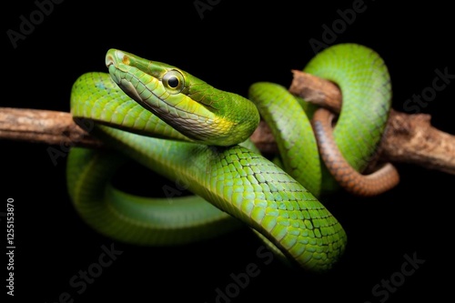 © Jame, Obraz premium Vibrant Green Snake on Branch with Dark Background