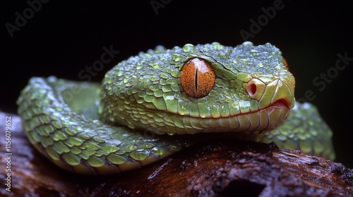 © gen_pick, Fototapeta premium Vibrant Green Snake with Red Face in Dark Jungle Setting
