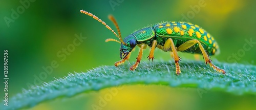 © Thanaseth, Naklejka premium Vibrant green stem with a colorful larva crawling along it, detailed macro shot showing the insect in nature, with a blurred background of the garden