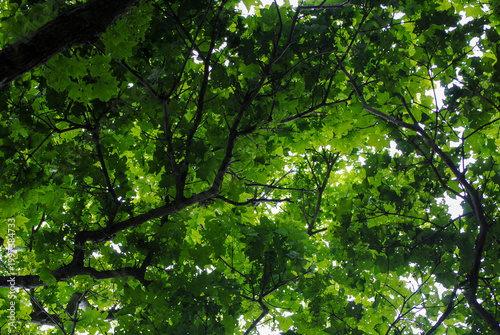 © Dariversus, Obraz premium Vibrant green summer leaves and tree trunks viewed from below, creating a stunning natural canopy.