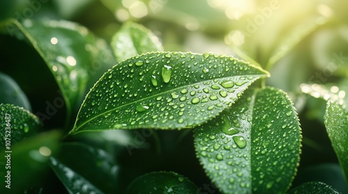 Fototapeta premium vibrant green tea leaves delicately arranged, glistening with dew, against a...