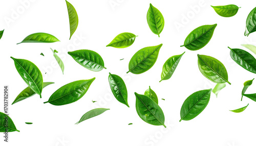 © Hendra, Naklejka premium Vibrant green tea leaves scattered against a black background