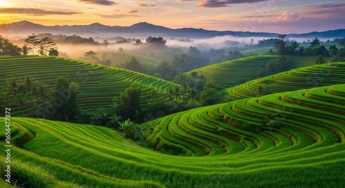 Fototapeta premium Vibrant green terraced rice fields bathed in golden morning light with misty...