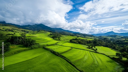 Fototapeta premium Vibrant green terraced rice fields under a blue sky with dramatic cloud...