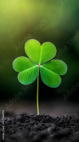 © NURI, Naklejka premium Vibrant green three-leaf clover sprout emerging from dark soil