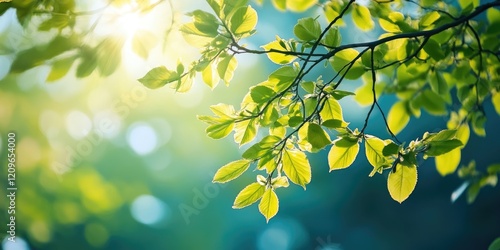 © Ahmad, Obraz premium Vibrant green tree branches with fresh leaves illuminated by sunlight against a soft blue background during a serene spring morning