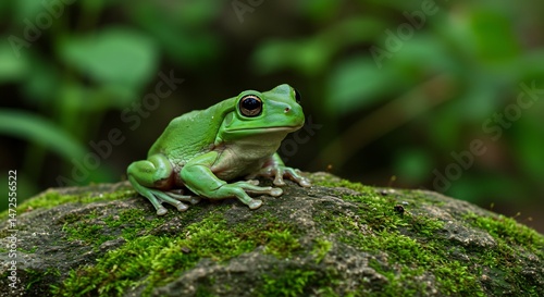 Fototapeta premium Vibrant green tree frog calmly sits on mossy rock bathed in soft sunlight. AI Generated