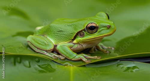 Naklejka premium Vibrant green tree frog resting on leaf in natural habitat