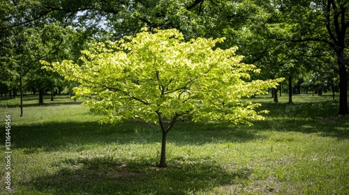 Naklejka premium Vibrant Green Tree with Bright Leaves Surrounded by Lush Park Landscape in...