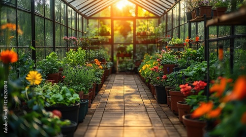 Fototapeta premium Vibrant greenhouse filled with blooming flowers and plants, sunlight streaming through glass panels