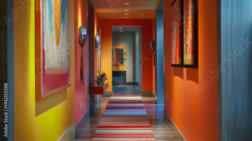 © Tuachan, Fototapeta premium Vibrant Hallway with Colorful Art and Modern Decor in Home