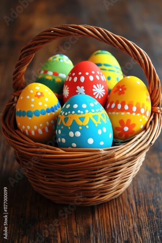 Fototapeta premium Vibrant Hand-Painted Easter Eggs in Wicker Basket on Rustic Wooden Table