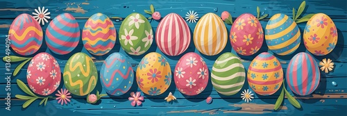 © Burak, Obraz premium Vibrant Hand-Painted Easter Eggs with Unique Artistic Patterns Colorful Designs Arranged on Rustic Blue Wooden Surface with Festive Spring Elements for a Cheerful and Joyful Easter Holiday Celebration