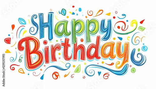 © Swaha, Fototapeta premium Vibrant hand-painted "Happy Birthday" design with colorful swirls and confetti, perfect for cards, invitations, and celebrations.