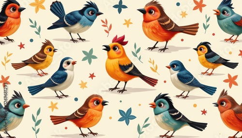 Fototapeta premium Vibrant HandDrawn Birds Against Cream Background: Whimsical Artwork in...