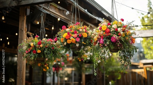 Fototapeta premium Vibrant Hanging Flower Baskets in Rustic Setting