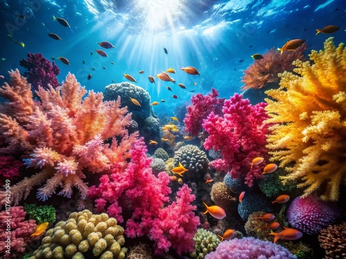 © Danicha, Fototapeta premium Vibrant Healthy Soft Coral Reef with Diverse Fish Life - Stunning Underwater Scene