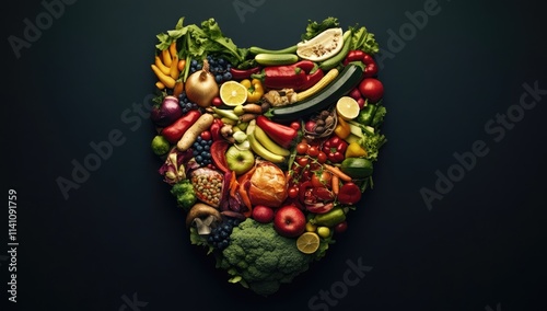 Fototapeta premium Vibrant heart-shaped design created from various fruits and vegetables.