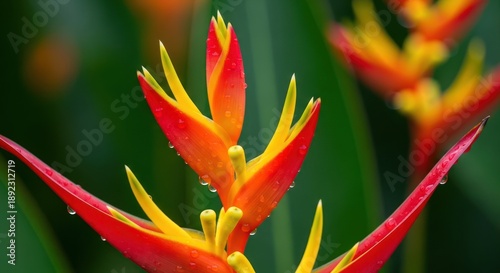 © Arthinart, Obraz premium Vibrant heliconia flower with water droplets against a lush backdrop