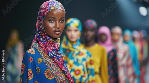 © Intelligent Horizons, Fototapeta premium Vibrant Hijab Fashion Trends Showcased on Runway with Diverse Models Displaying Elegant Modest Wear Designs