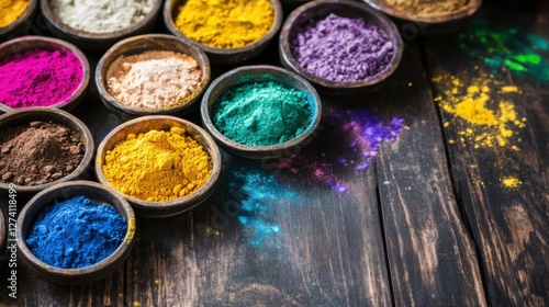 Naklejka premium Vibrant Holi Powder Colors in Bowls on Dark Wood Background
