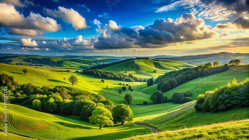 Fototapeta premium Vibrant horizon stretches across serene blue sky, meeting lush green rolling...