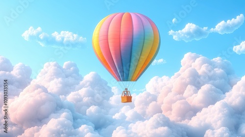 © Diegeme, Fototapeta premium Vibrant Hot Air Balloon Floating Through Soft, Fluffy Clouds Under a Clear Blue Sky with Gentle Sunlight Illuminating the Colorful Canopy