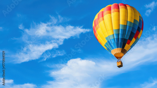 © Tee nuT, Obraz premium Vibrant hot air balloon floats gracefully in clear blue sky, surrounded by fluffy white clouds, evoking sense of adventure and freedom