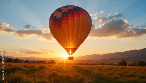Naklejka premium Vibrant hot air balloon soaring at sunrise, uplifting adventure