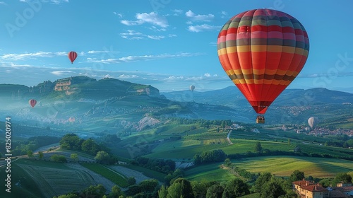 © khairulz, Obraz premium vibrant hot air balloon soaring high in a clear blue sky with a picturesque landscape