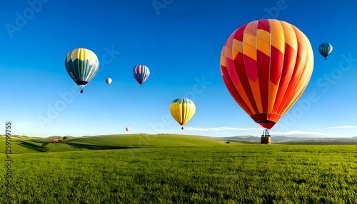 © Kaan, Obraz premium Vibrant hot air balloons floating over lush green fields under a clear blue sky